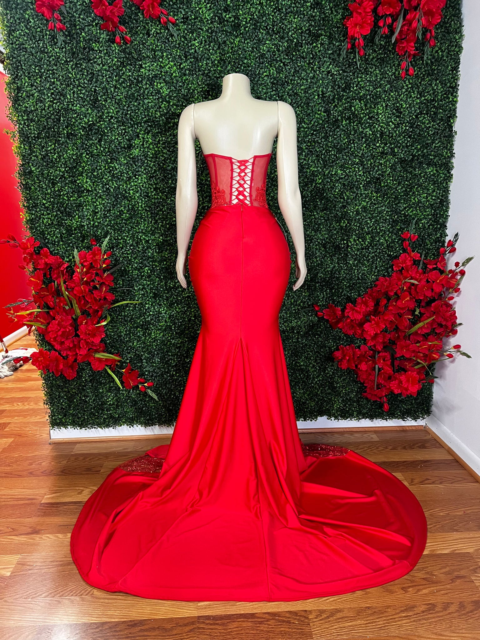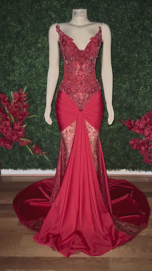 This red corset gown is like no other! Glitter mesh front and a stretchy solid back for the base with a unique drape centered front. Corset features beautiful matching color red rhinestones and lace details. Dress is has some stretch sold as is. Only 1 made.