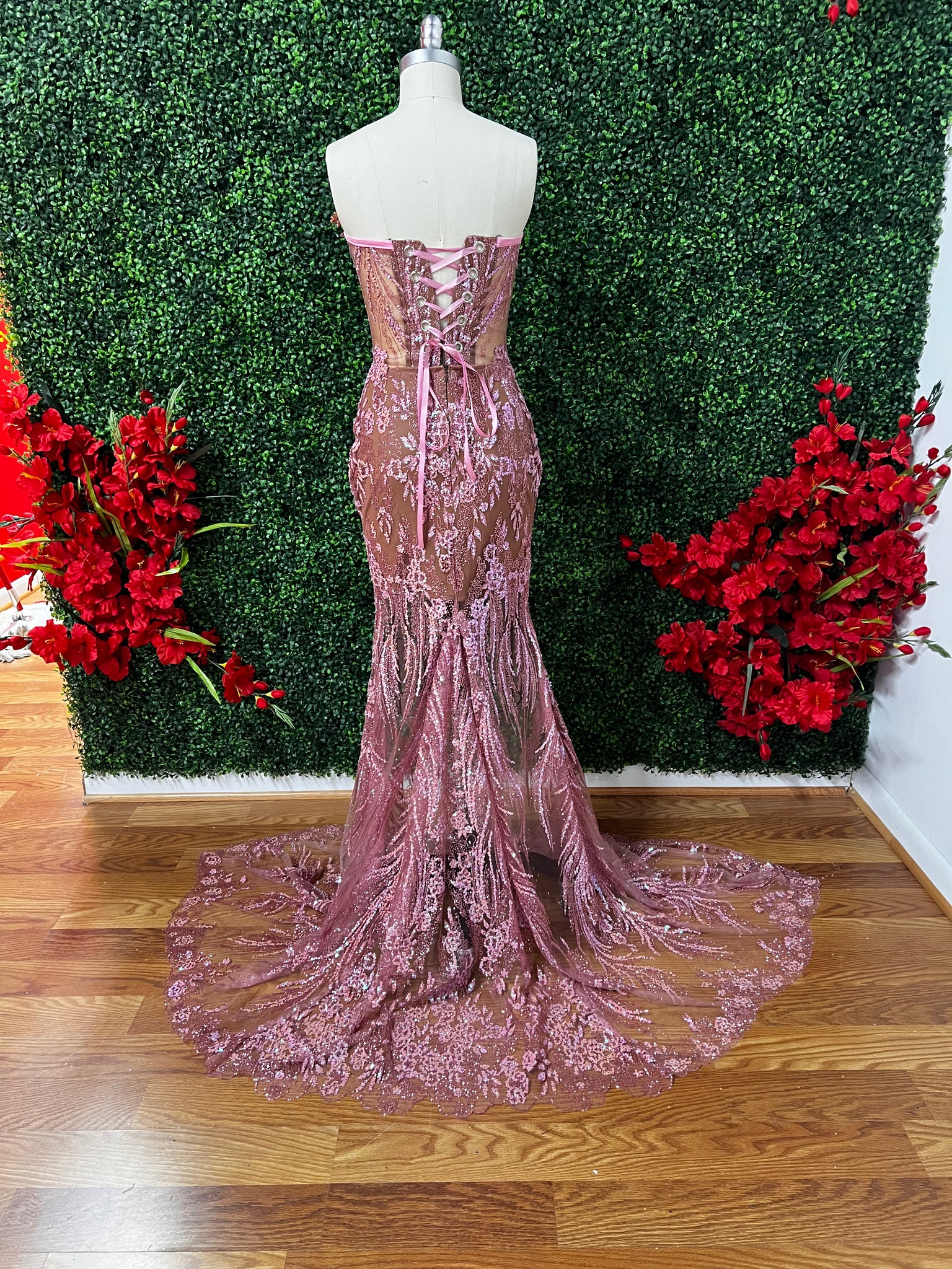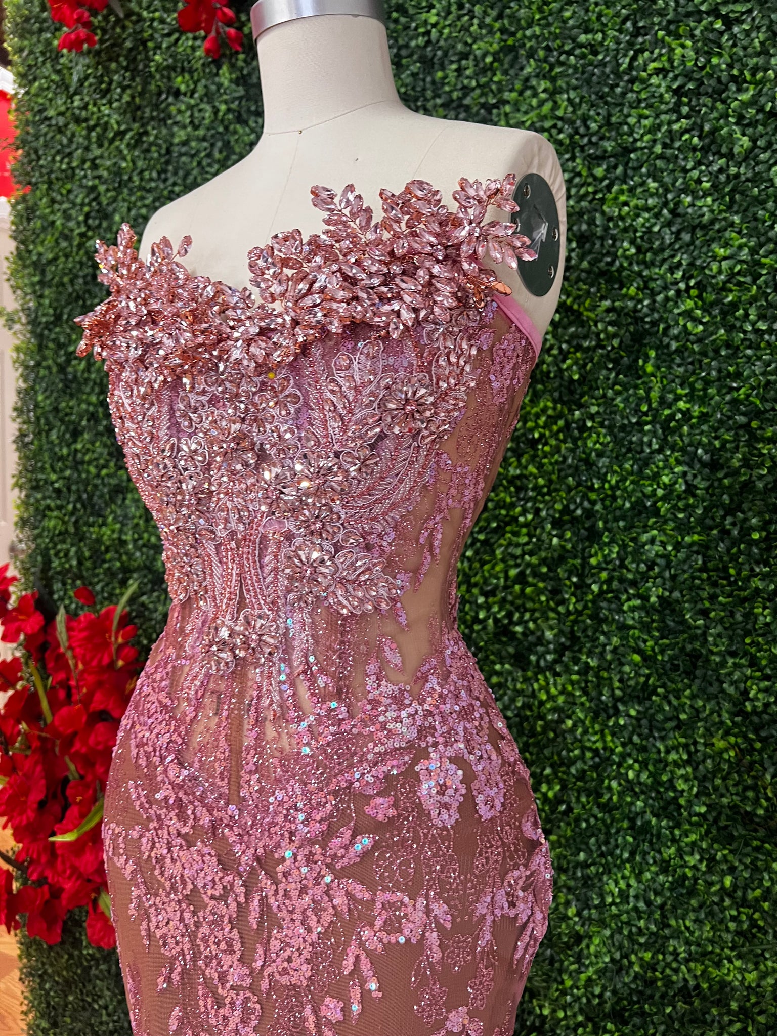 This beautiful corset style gown will have you sparkling all night! With a dazzling pink glitter mesh base and matching pink rhinestones and 3d pieces that cover the top of the corset. Brown skin town lining. This dress does not stretch. Hip(y) size 2 can be altered