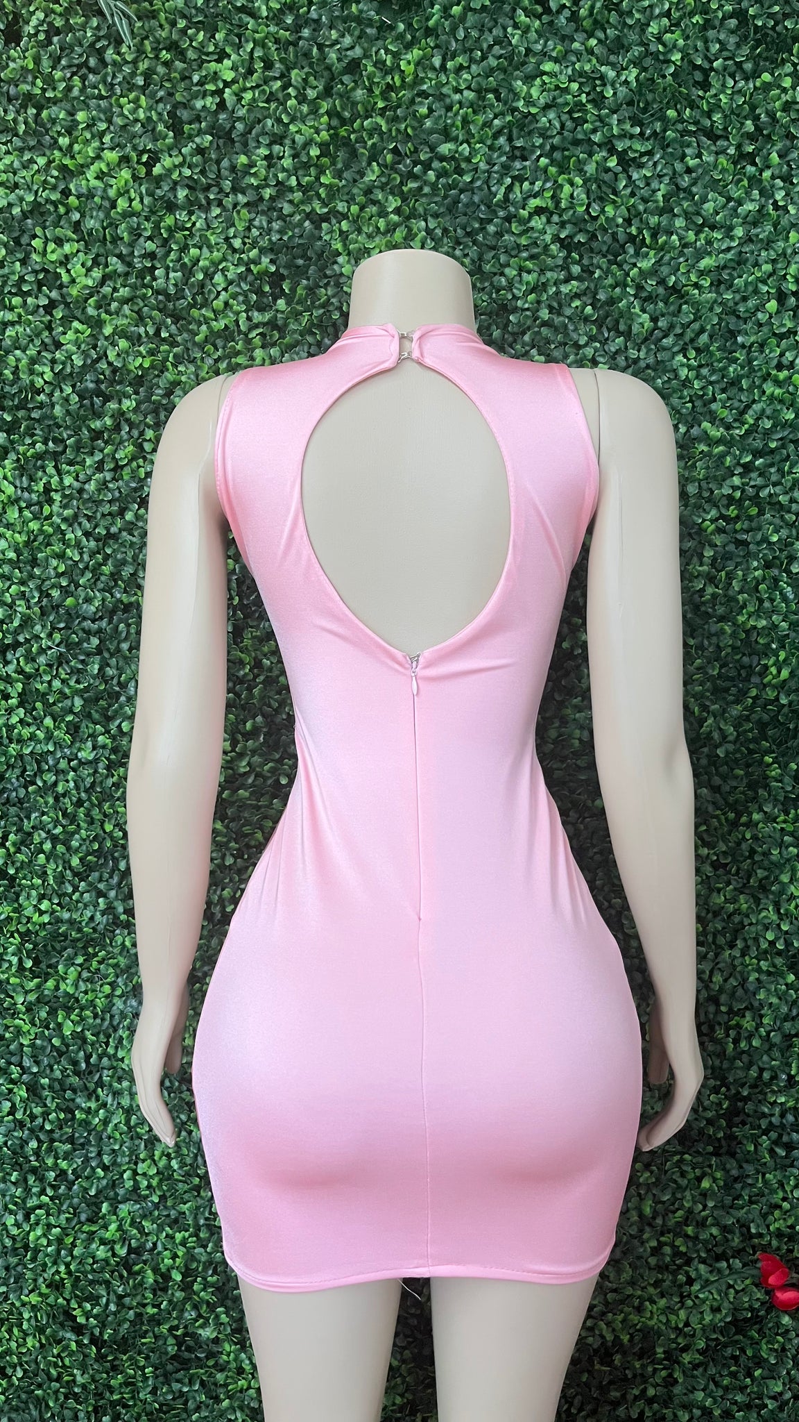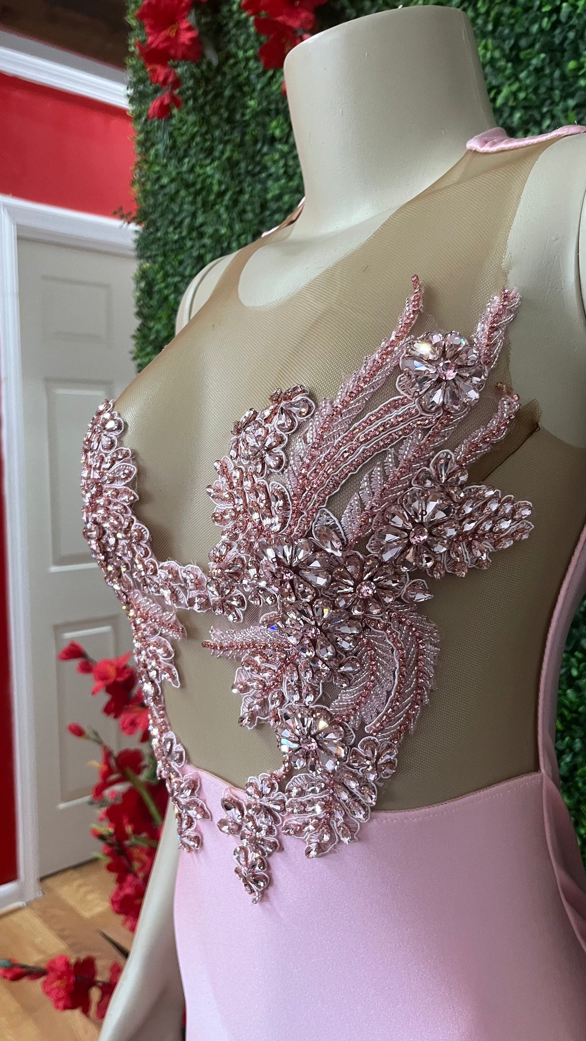 This pink mini dress features our famous illusion mesh that matches most melanin skin tones for the perfect match. Dress has stretch, open back and matching pink rhinestones…. This dress is only made up til size medium for this price. Can be made in larger sizes for an added price for breast coverage!